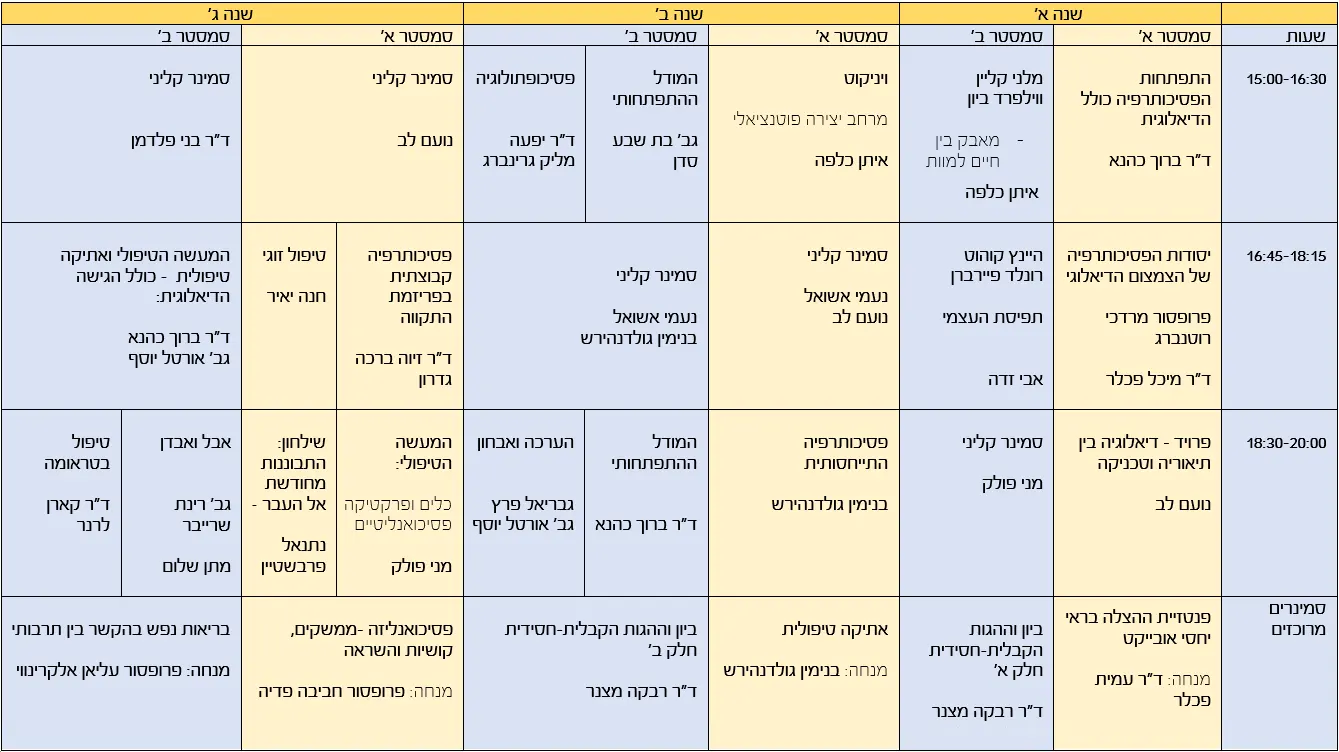 ביה"ס הדיאלוגי לפסיכותרפיה, נועד למטפלים השואפים להרחיב את הידע התיאורטי, יחד עם הבנה טיפולית מעמיקה בתיאוריות פסיכואנליטיות קלאסיות ועכשוויות. התכנית מלמדת באופן מעמיק רחב ומקיף את הזרמים המרכזיים של התיאוריות הדינאמיות הקלאסיות והעכשוויות: פרויד, קליין, ויניקוט, קוהוט, ביון, והגישה האינטר-סובייקטיבית כתוכנית ליבה ואת המפגש עמן דרך הגישה הדיאלוגית של החשיבה היהודית.