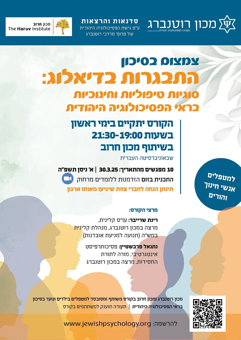הקורס נועד להעמיק את הבנת תקופות הילדות וההתבגרות דרך הפרספקטיבה היהודית-הדיאלוגית ולספק כלים מעשיים להתמודדות עם אתגרי הגילים הללו, הן ברמה האישית והן ברמה הקלינית-טיפולית. תוך הבנת תהליכי ההתפתחות הרגשית והחברתית של ילדים ונוער. תקופות אלו מאופיינת בקונפליקטים פנימיים וחיצוניים, התמודדות עם גיבוש זהות עצמית, גבולות ומערכות יחסים משמעותיות. הגישה הדיאלוגית מאפשרת לפתח אופני שיח שמצד אחד תומכים ביצירת ייחודיות וביטחון עצמי בקרב ילדים ובני נוער, ומצד שני מטפחים קשרים משמעותיים עם דמויות מיטיבות.